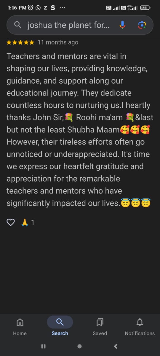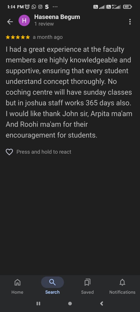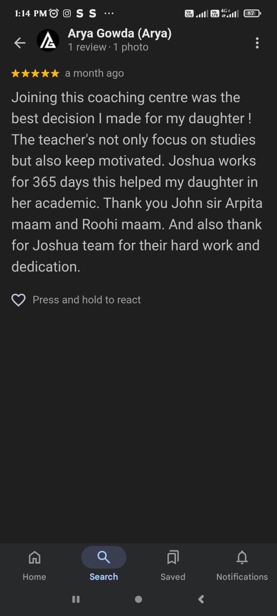 Joining this coaching center was the best decision I made for my daughter! The teacher's not only focus on studies but also keep motivated. Joshua works for 365 days this helped my daughter in her academic. Thank you John sir Arpita maam and Roohi maam. And also thank for Joshua team for their hard work and dedication.